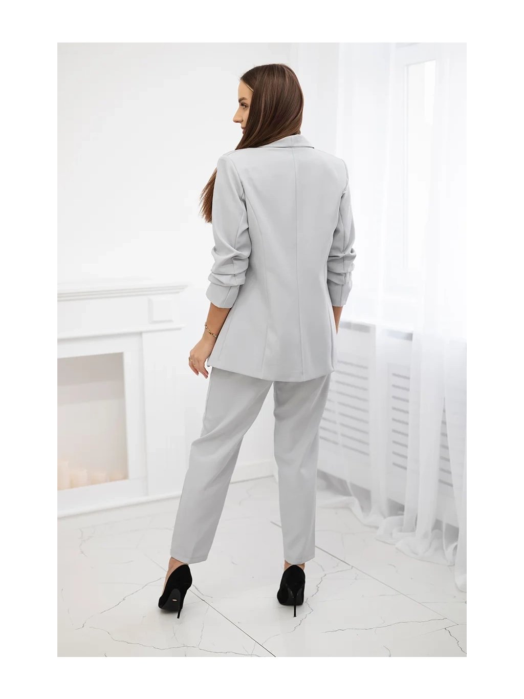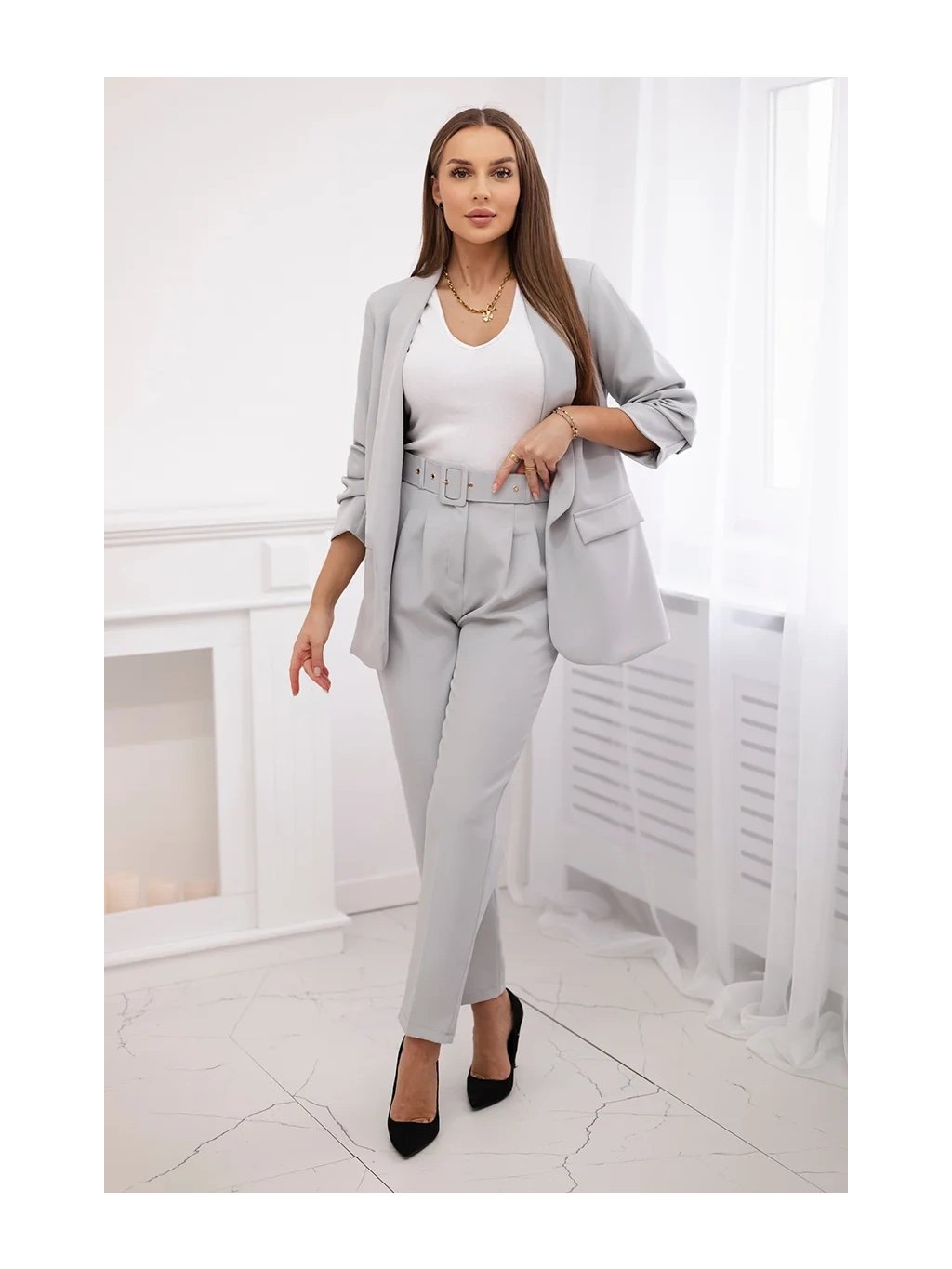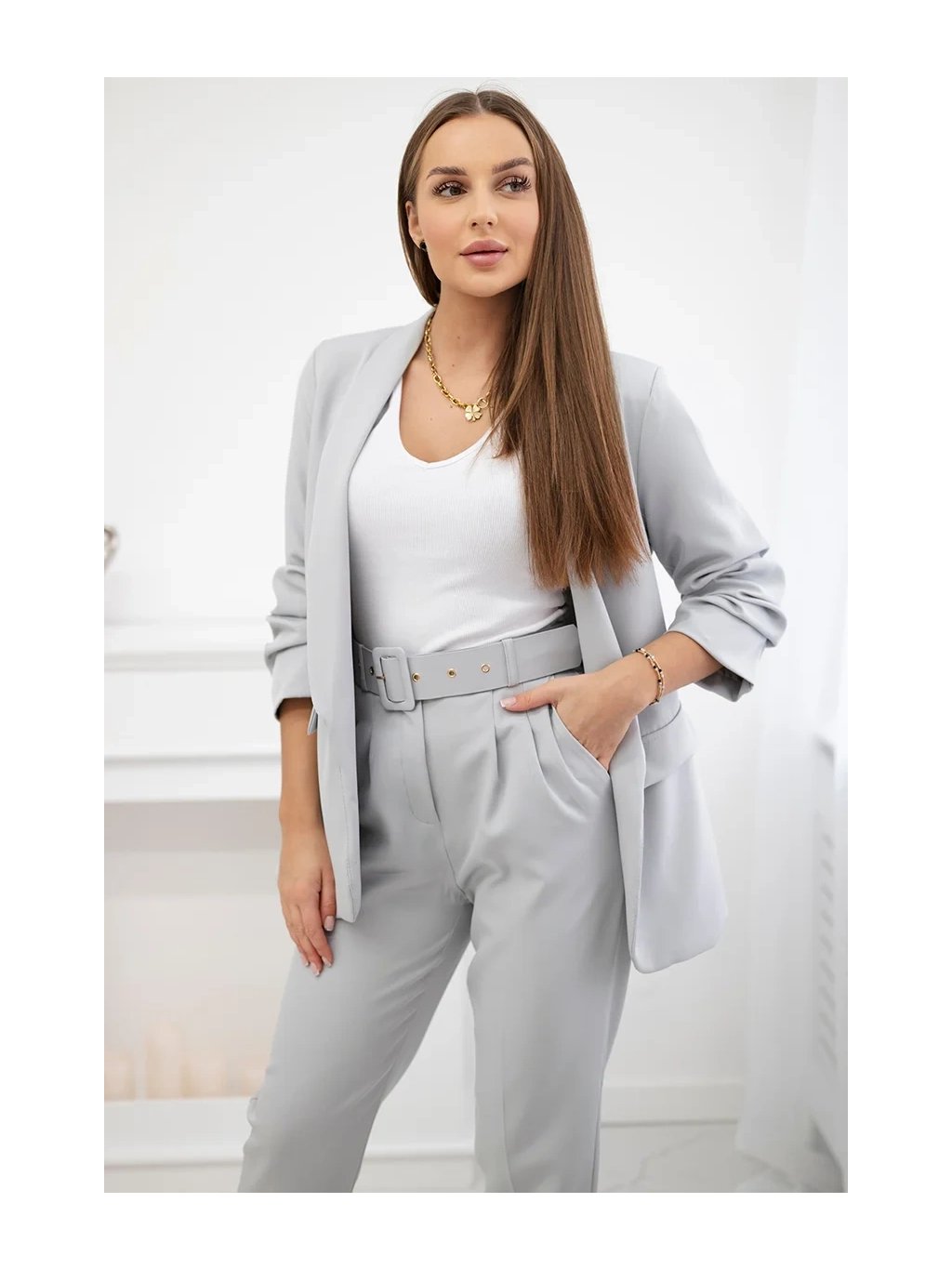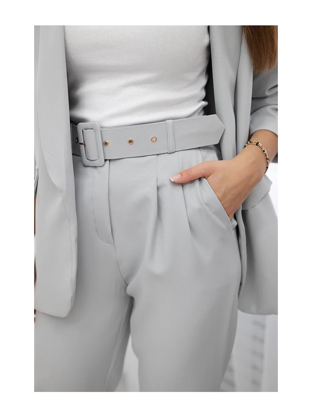 Elegantní a stylová sada saka a kalhot Daisy ve světle šedé barvě italské výroby. Sako je bez knoflíků s předními klopami a s podšívkou, kalhoty mají pásek, kapsy a pružný pásek všitý do pasu na zadní straně. Představujeme vám elegantní sadu saka a kalhot. Bunda bez knoflíků s předními klopami. Bunda má podšívku. Kalhoty s kapsami a páskem. Velikost je univerzální a vyhovuje dámám velikosti S, M nebo L.