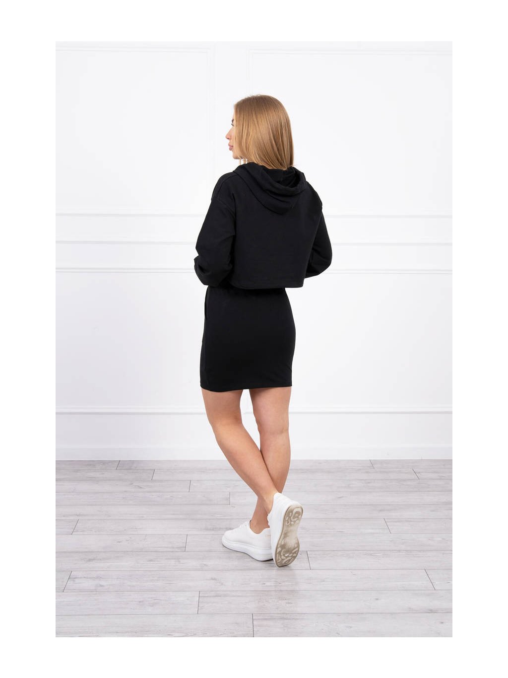 Komplet mikiny se sukní. Mikina má kratší střih je s kapucí a šnůrkami na stažení. Sukně je krátka, má dve kapsy v bočním švu a je na zavazováním v pase. Komplet je vyrobena z vysoce kvalitního materiálu. Velikost je univerzální a bude vhodná pro dámy velikosti XS, S, M.