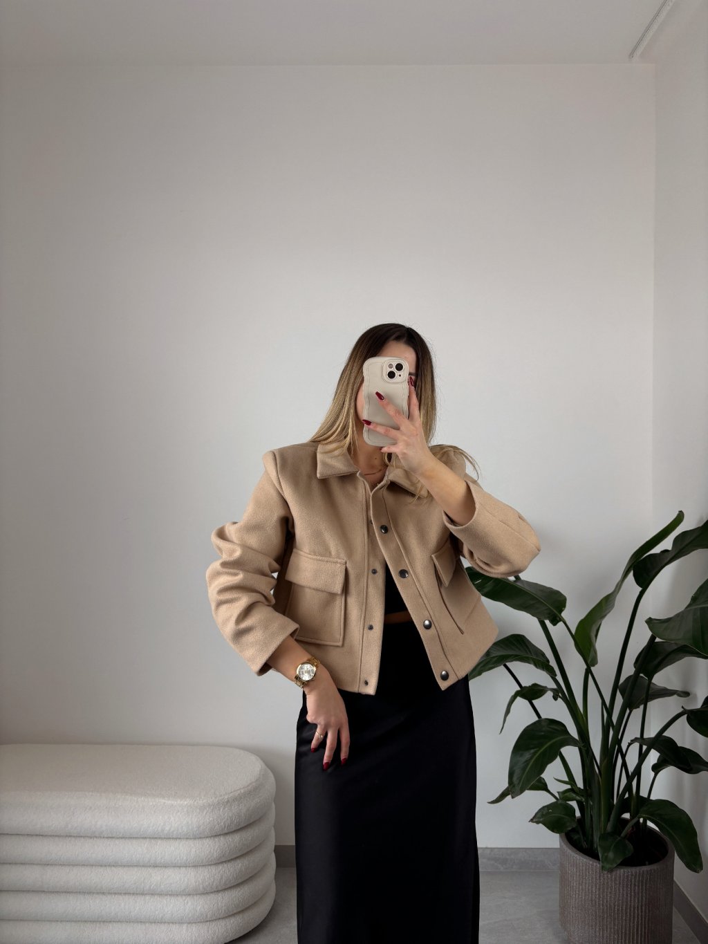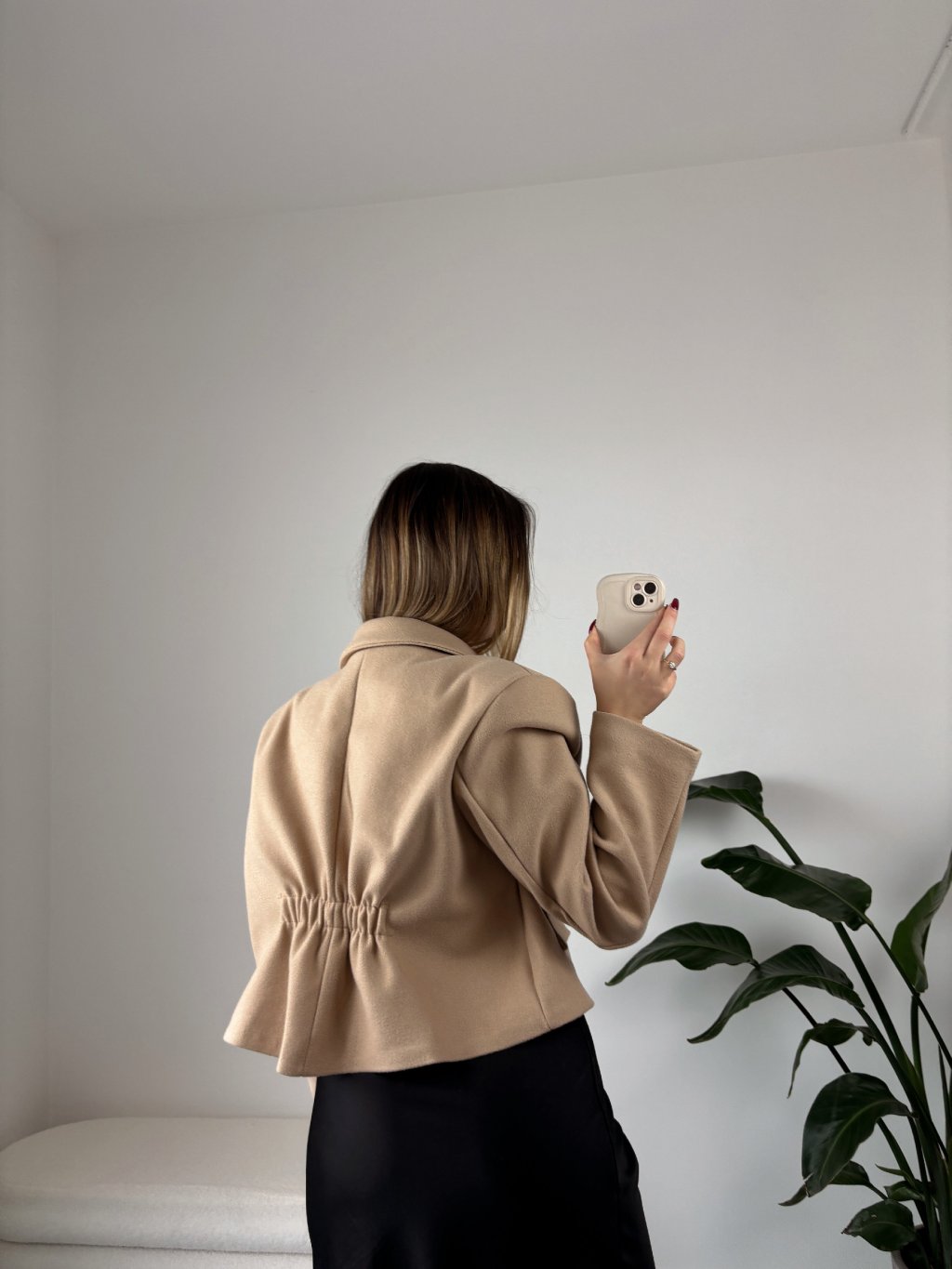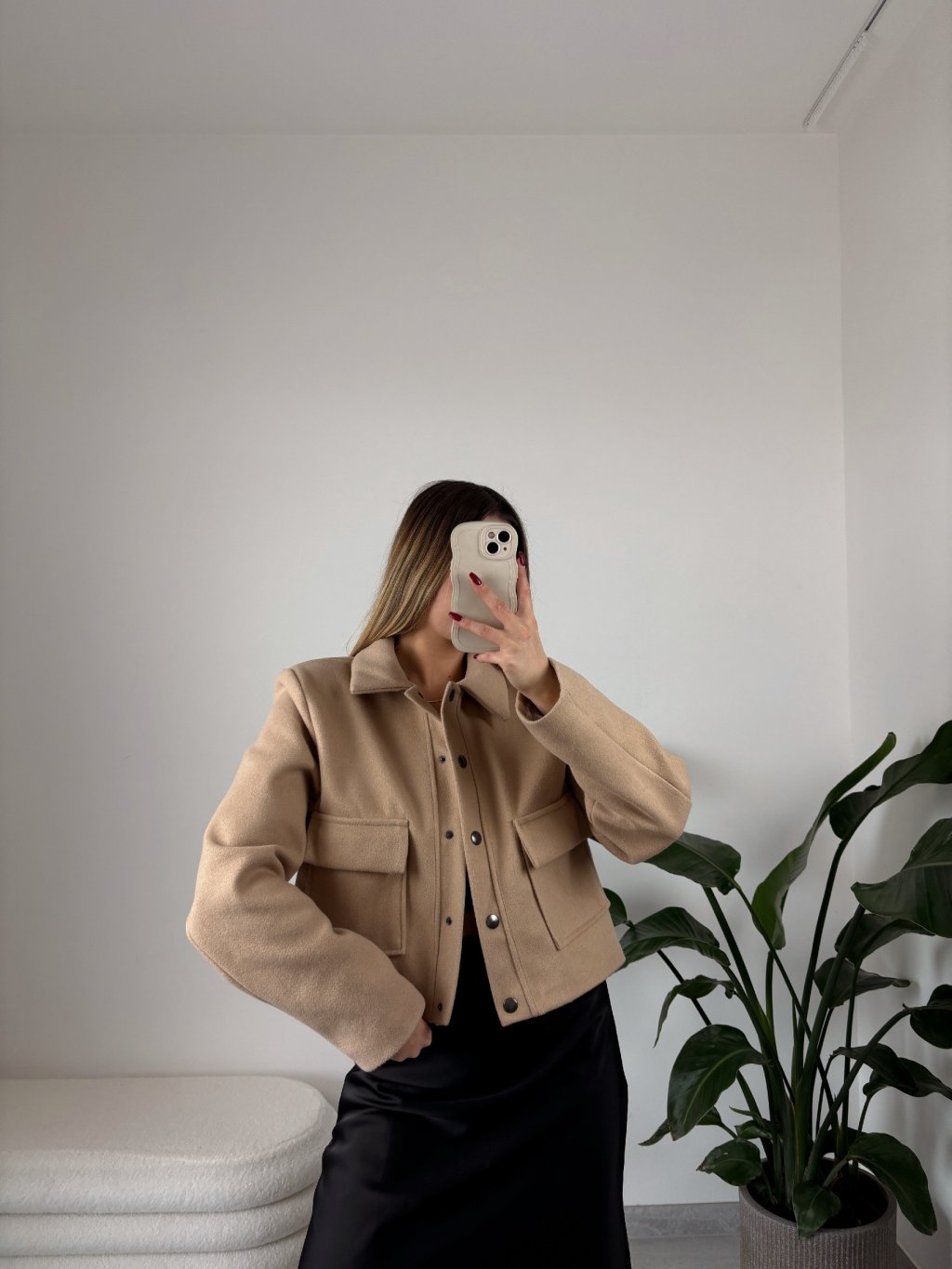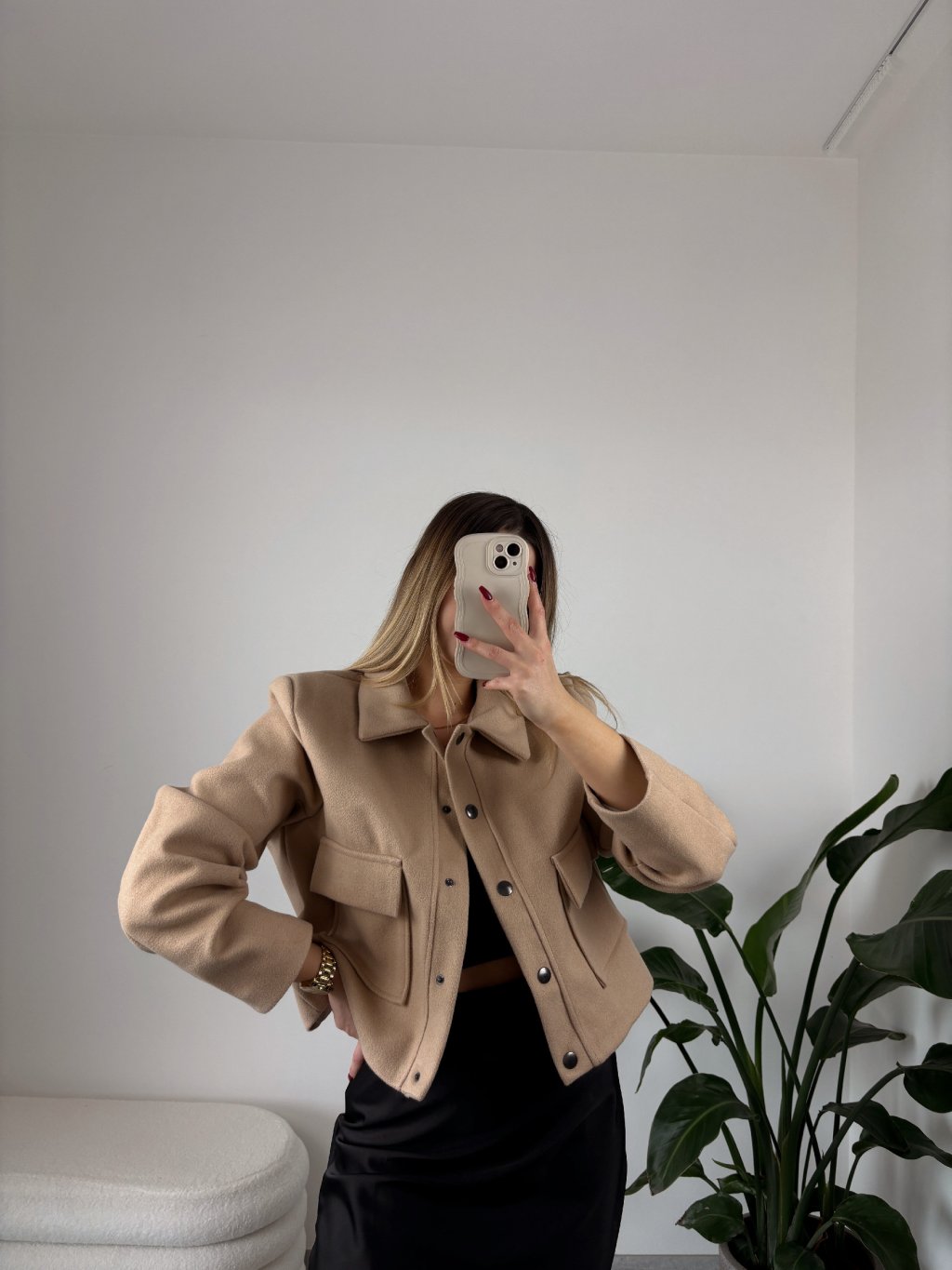 Stylová bunda krátkého střihu s límečkem a kapsami na přední straně v camel barvě. Zapínání na knoflíky, bunda má tenkou podšívku a vycpávky na ramenou. Velikost je univerzální, sedí na XS,S,M i menší L. Foceno je na výšce 162 cm a velikosti XS-S.