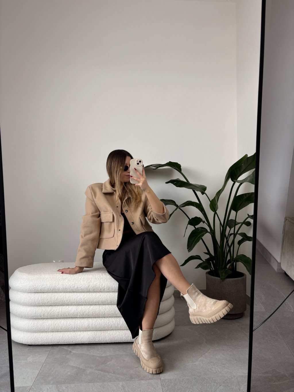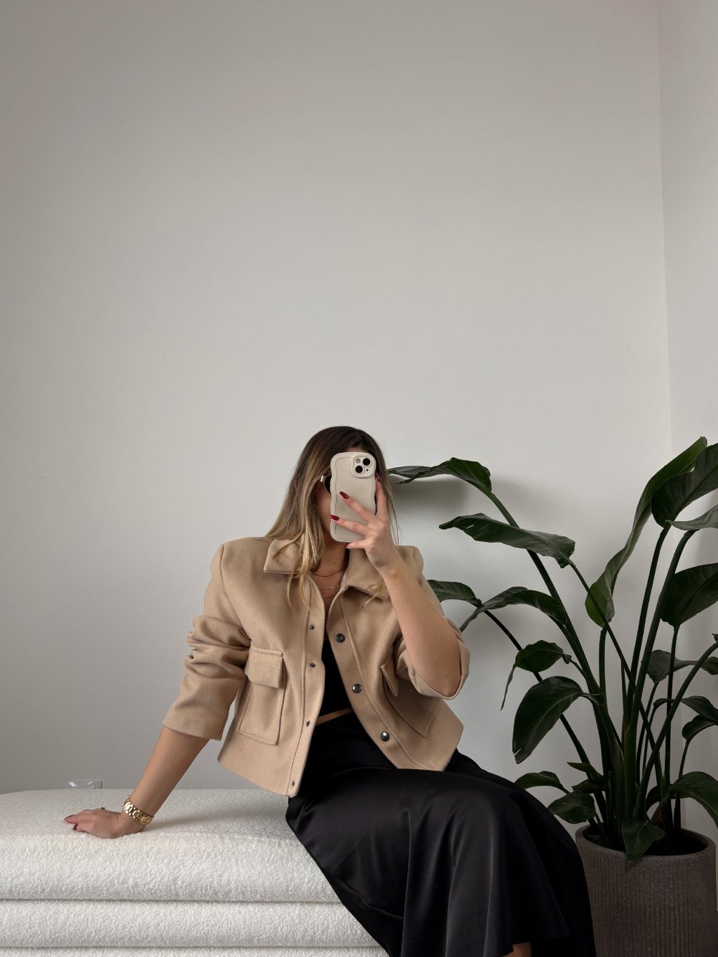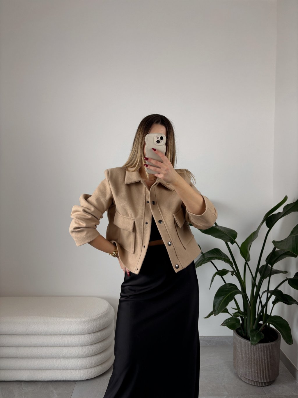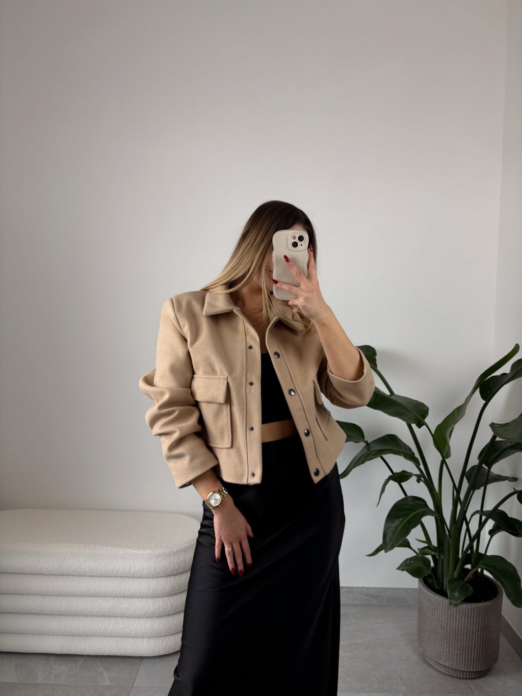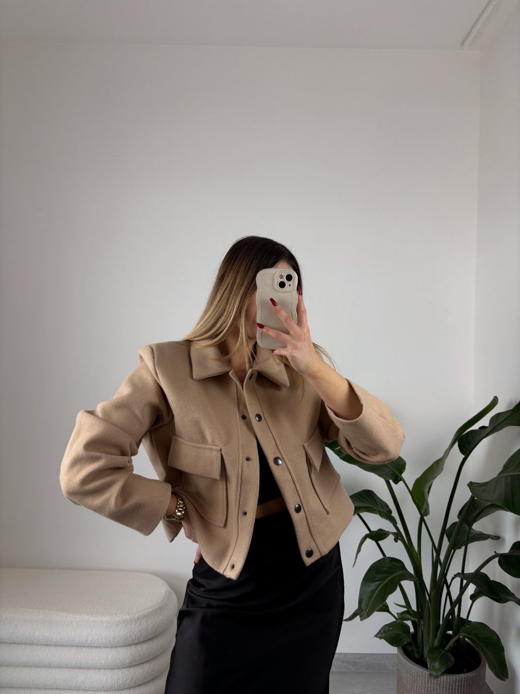 Stylová bunda krátkého střihu s límečkem a kapsami na přední straně v camel barvě. Zapínání na knoflíky, bunda má tenkou podšívku a vycpávky na ramenou. Velikost je univerzální, sedí na XS,S,M i menší L. Foceno je na výšce 162 cm a velikosti XS-S.