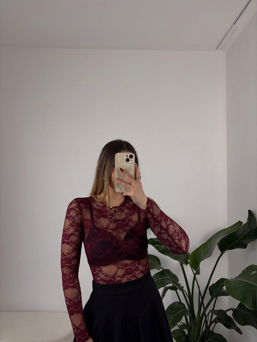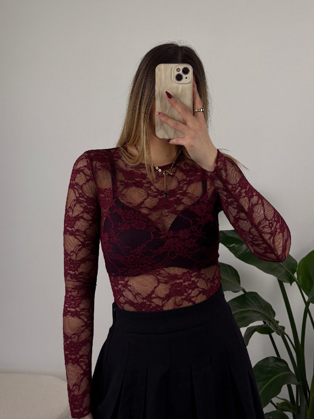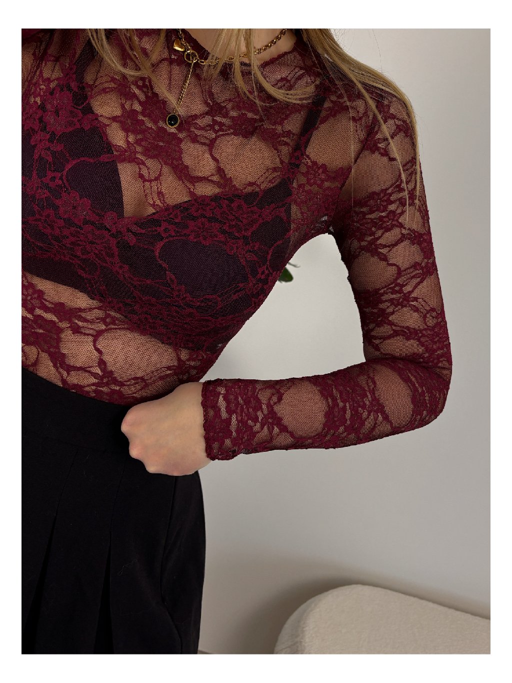 Sexy průsvitné krajkované body Eris v trendy burgundy barvě. Dlouhý rukáv, uplý střih, zapínání ve spodní části na 3 háčky. Dostupné ve velikosti S, M a L. Foceno na velikosti XS/S (velikost topu S) a výšce 162 cm.