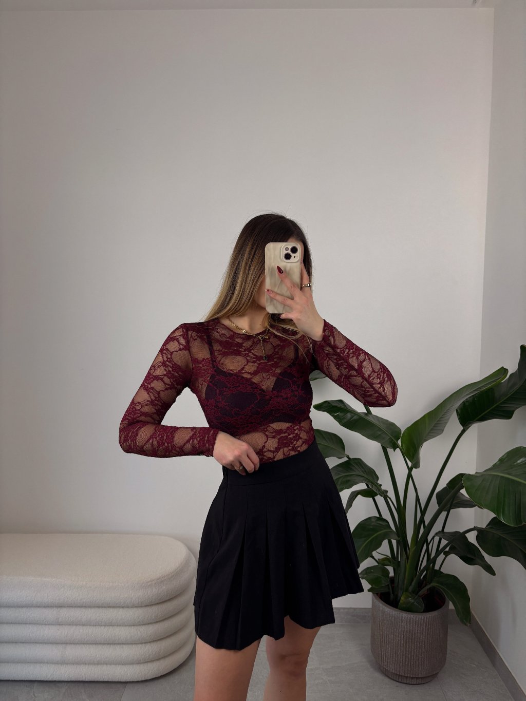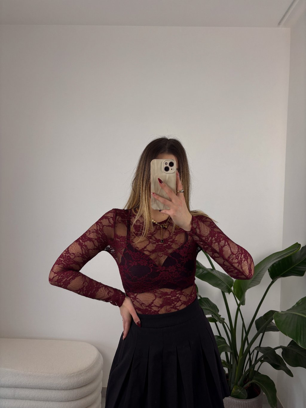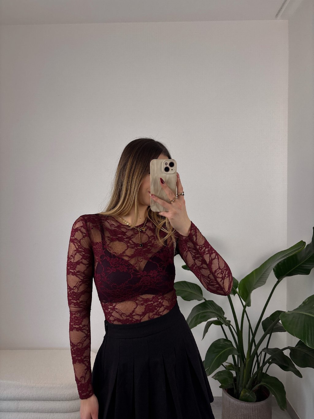 Sexy průsvitné krajkované body Eris v trendy burgundy barvě. Dlouhý rukáv, uplý střih, zapínání ve spodní části na 3 háčky. Dostupné ve velikosti S, M a L. Foceno na velikosti XS/S (velikost topu S) a výšce 162 cm.