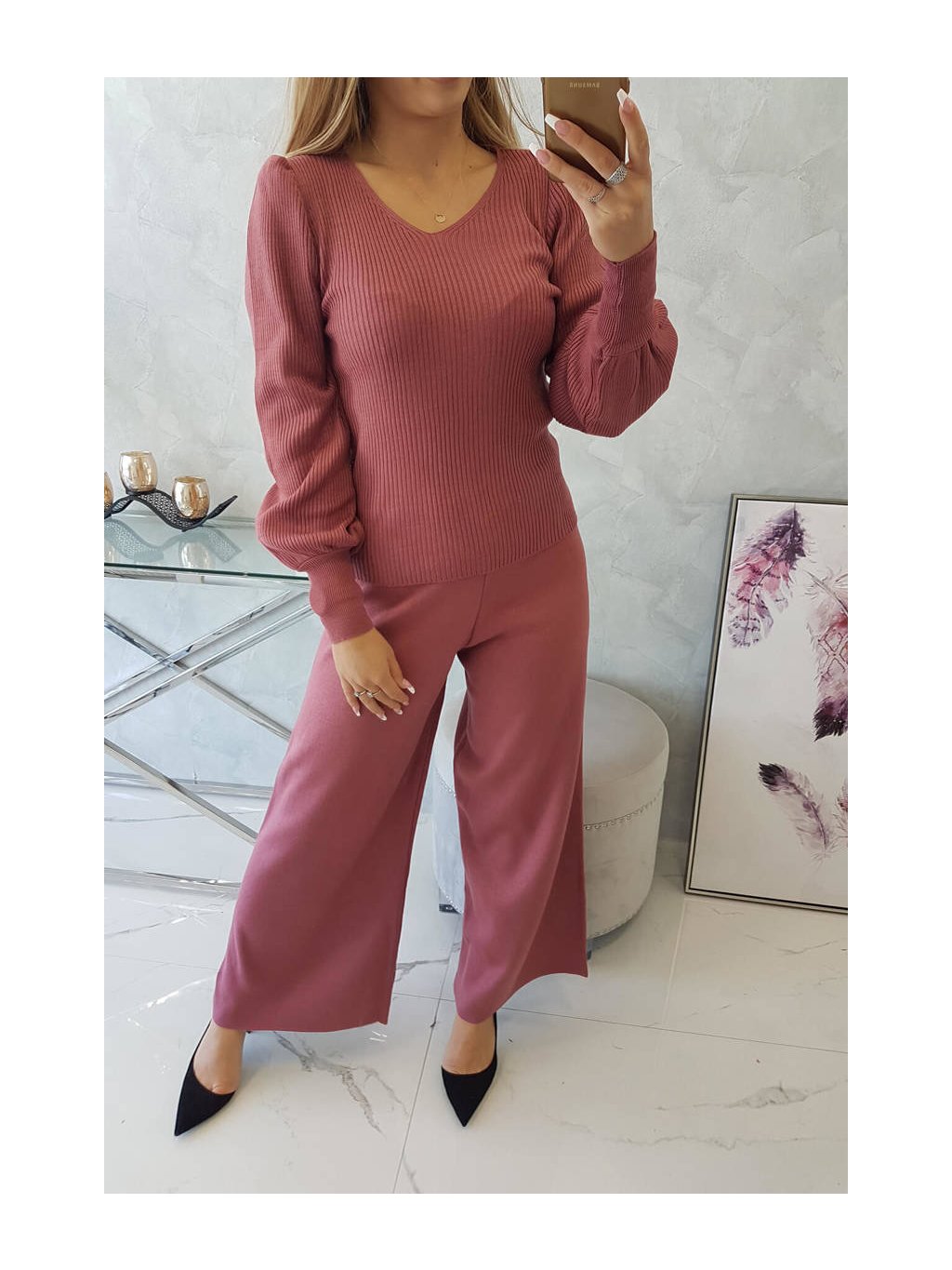Módní souprava. Souprava se skládá z halenky a kalhot. Kalhoty mají široké nohavice, a žebrovaný top. Sada je vyrobena z vysoce kvalitního materiálu. Velikost je univerzální a bude vhodná pro dámy ve velikostech XS, S, M, L.
