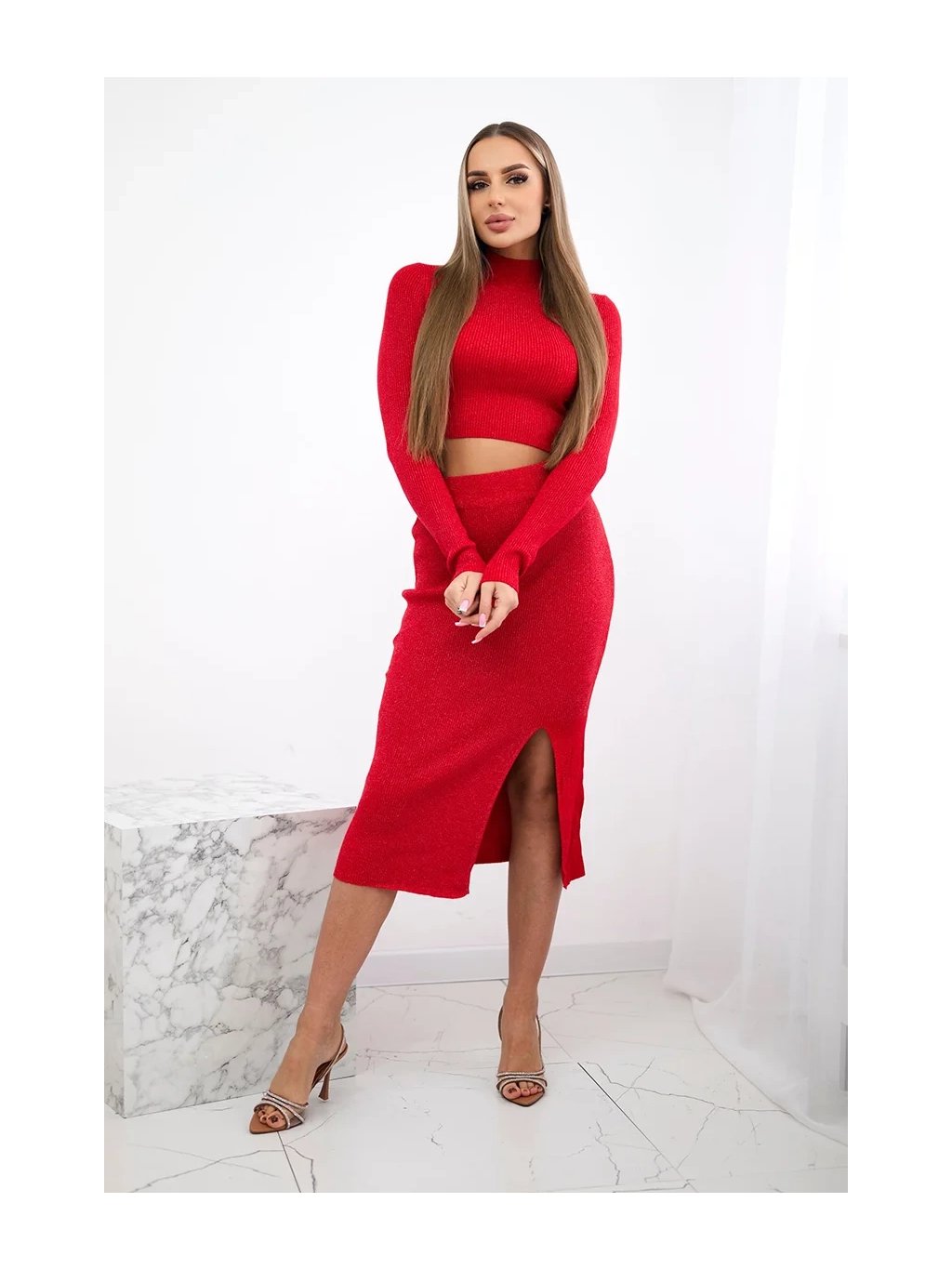 Žebrovaný komplet skládající se z rolákového trika a sukně do pasu. Vyrobený z pružné žebrované tkaniny s jemným třpytivým detailem, dokonale se přizpůsobí postavě a zvýrazní její přednosti. Halenka má klasický střih, který se skvěle hodí k sukni a vytváří soudržný a módní vzhled. Tento komplet je ideální jak na denní nošení, tak na večerní výlety – můžete ho nosit jak s podpatky, tak se sportovní obuví, čímž vytvoříte outfity plné charakteru a pohodlí. Velikost je univerzální a je vhodná pro dámy ve velikosti S, M nebo L.